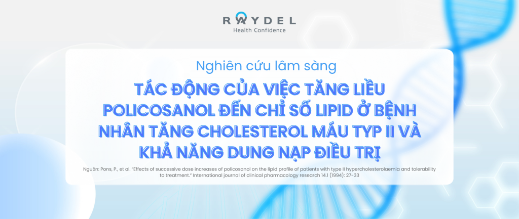 Nghiên cứu mù đôi, đối chứng giả dược trên 22 bệnh nhân tăng cholesterol type II đánh giá hiệu quả tăng liều dần của policosanol (5 mg/ngày ➝ 10 mg/ngày ➝ 20 mg/ngày). LDL‑C giảm tương ứng 11,3% ➝ 21,9% ➝ 31,2%, tổng cholesterol giảm đến 23%. HDL‑C tăng nhẹ; tỉ lệ LDL‑C/HDL‑C giảm đáng kể. Không có tác dụng phụ nghiêm trọng; thuốc dung nạp rất tốt.